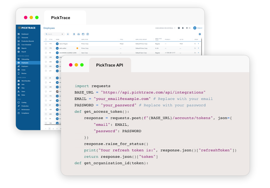 Customers and third-party developers use the PickTrace API to integrate labor data across their organizations